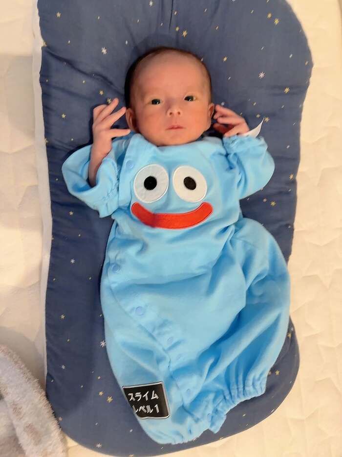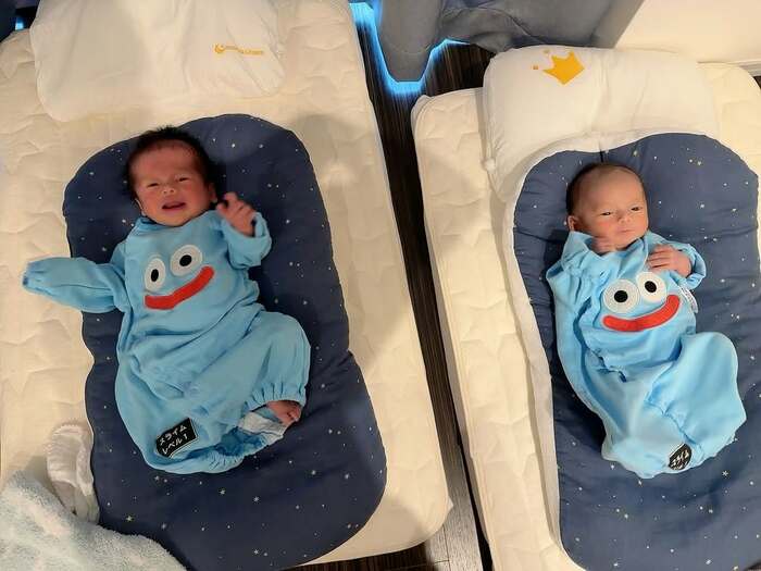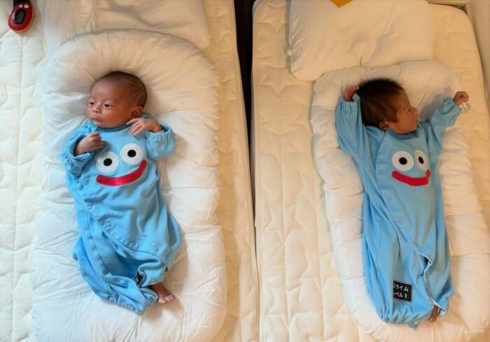 そこには、人気ゲーム『ドラゴンクエスト』に登場するキャラクター・スライムのベビー服をバッチリ着こなす双子の姿が!水色カラーの洋服に大きくスライムの顔がデザインされています。