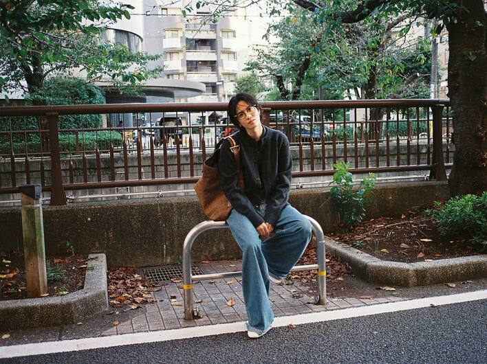 さらに、川沿いの道を散歩している様子の志尊さんは、アーチ状の鉄のポールに軽く腰掛け、首をかしげながらカメラを見つめる全身ショットも。