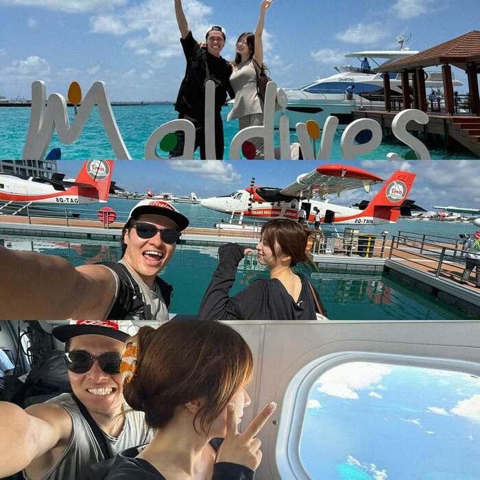 そこには、「Maldives」の大きなオブジェとともに、片手を元気よく挙げて記念撮影をするりこさんとたつやさんの姿が!宿泊先には水上飛行機を使うこともあったそうで、非日常感を味わえそうです。
