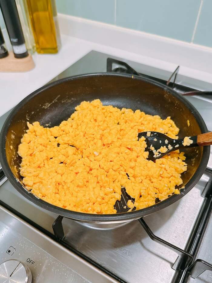 渡辺さんはフライパンでフワフワな卵そぼろを作っていきます。