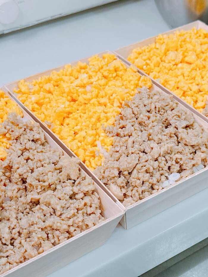 今回は「2色丼」を作るそうで、3つのお弁当箱にキレイに卵そぼろと鶏そぼろを敷き詰めます。
