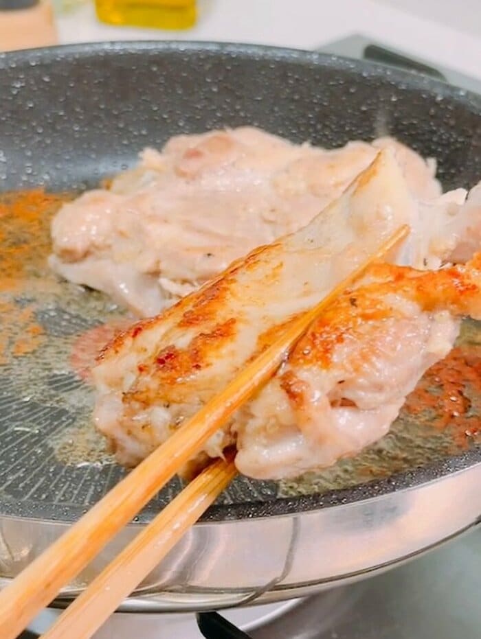 今度はフライパンで大きな鶏もも肉を焼いていきます。こんがりと焼き色がついていて、そのままかぶりつきたくなっちゃいます。