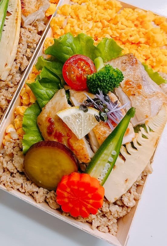 夫と息子2人のために作った豪華な2色丼弁当を披露しました。