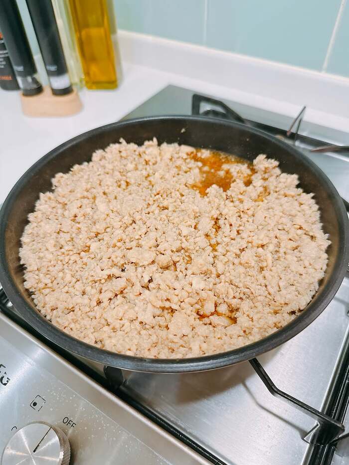 お次は、フライパンで鶏そぼろを炒めていきます。