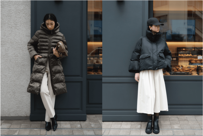 目を引くデザインながらも、ショート丈なので、合わせるボトムを選ばずに着られます。冬のスタイリングをモダンに見せてくれる一着です。
