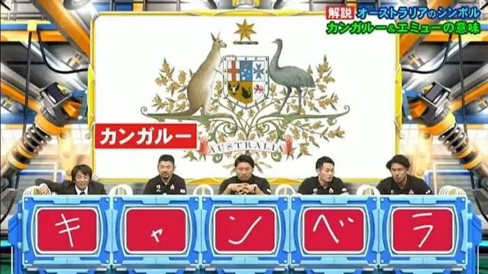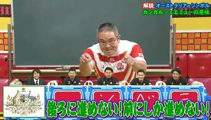 首都「キャンベラ」を問う問題にちなんで、オーストラリアの国章について解説してくれたのは、満を持してラグビー日本代表のユニフォームで登場した村瀬先生だ。