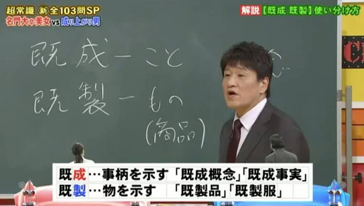 「常識漢字バトル」に出題された「キセイヒン」の「既製」と、同音異義語の「既成」。どちらも「既にできあがった」という同じ意味を持つ言葉だが、林先生によると厳密には用法が違うという。