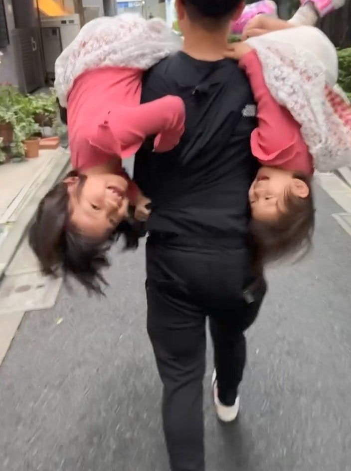ののちゃん姉妹 お父さんに担がれる!?「うれしそうでほのぼの」