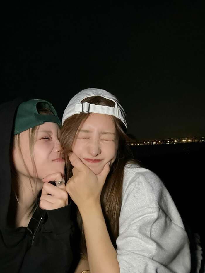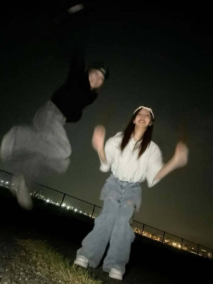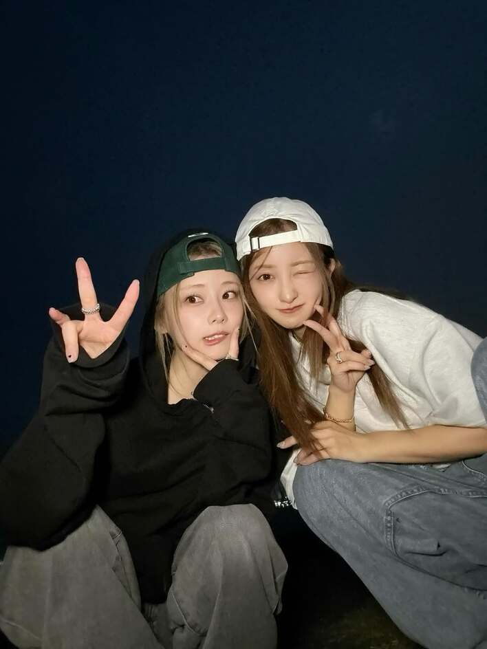 辺りが暗い夜の雰囲気と、ストリートコーデでのポーズも相まって、ギャル感あふれる仲良しショットに仕上がっています!