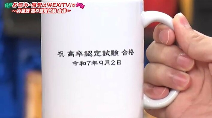 スカしながらも、何かに気付いた兼近さんは「えー!?すげー!」と声をあげ、手元にあるマグカップを凝視。するとそこには「高卒認定試験 合格」の文字と、合格した日付が刻まれていました。