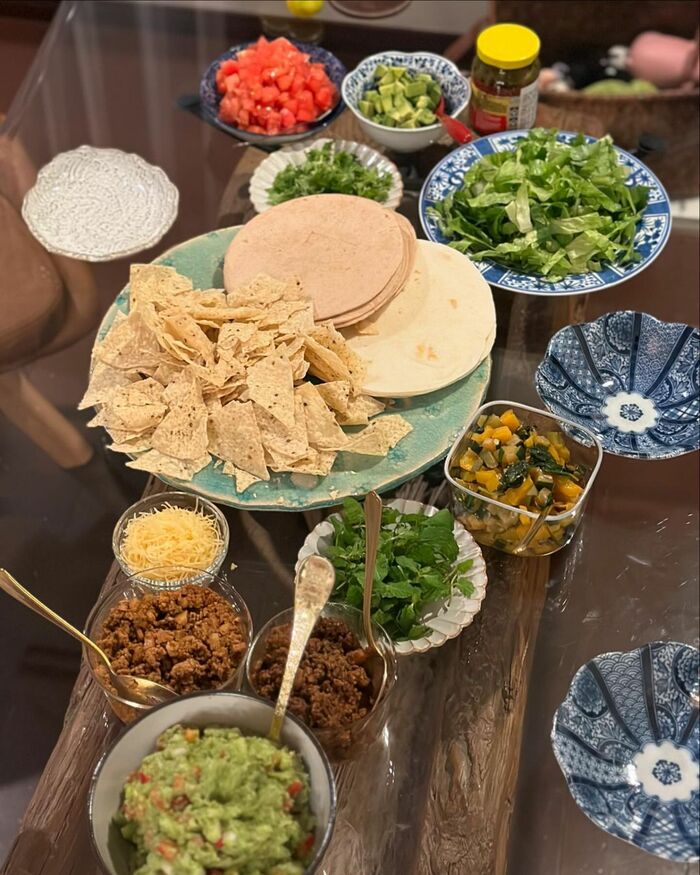 また、テーブルの上にたくさんのタコスの食材が並んだショットも。投稿文では、今回タコスを持参してくれた村上さんを「#村上タコス佳菜子」と呼ぶ仲良しぶりも見せています。