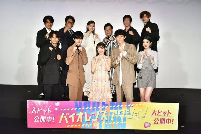 映画「バイオレンスアクション」の公開記念舞台挨拶が8月20日に行われ、主演の橋本環奈さん、杉野遥亮さん、鈴鹿央士さん、馬場ふみかさん、森崎ウィンさん、大東駿介さん、太田夢莉さん、城田優さん、高橋克典さん、岡村隆史さん、瑠東東一郎監督が登壇しました。
