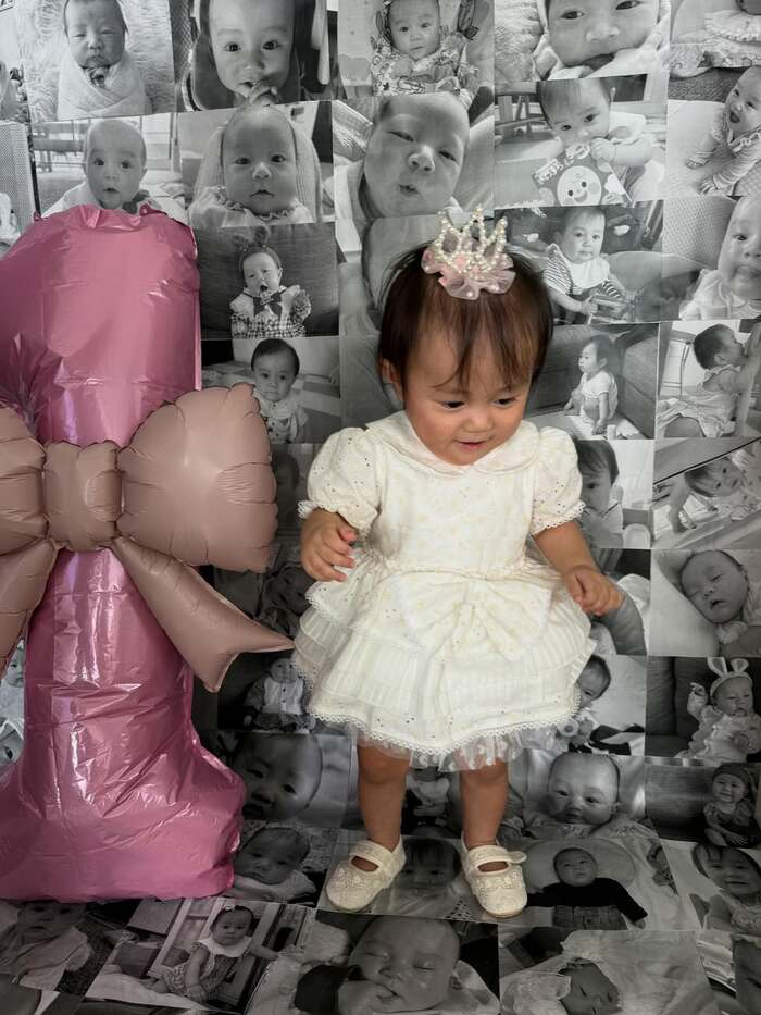 1歳の誕生日当日の投稿では、ピンク色のドレスを着たにこりちゃんの姿を公開!