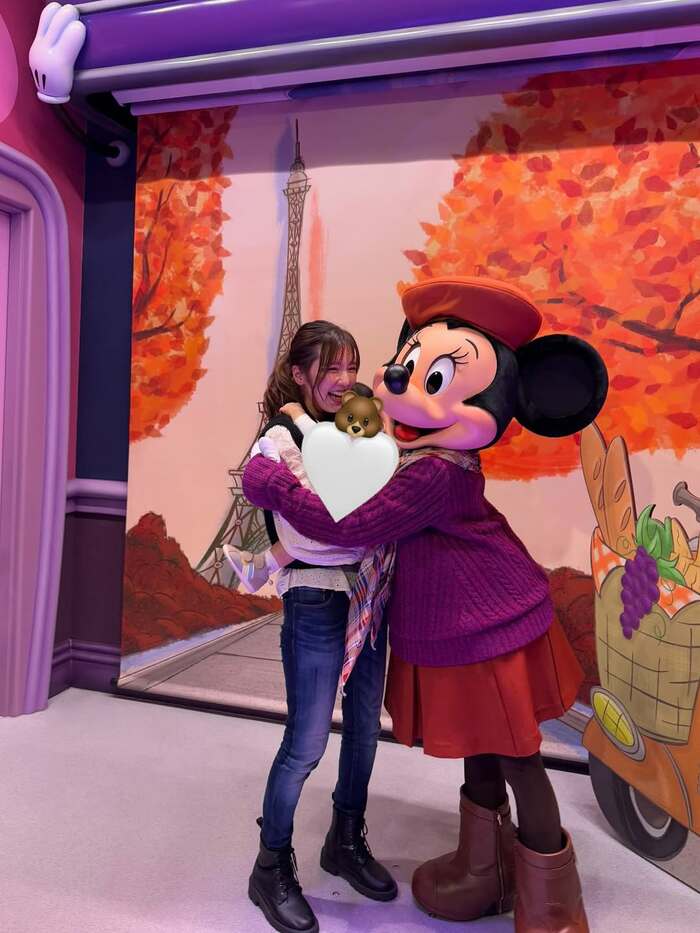 ミニーマウスからのあたたかいハグに真野さんもうれしそうな笑顔を浮かべ、「今回はびっくりして泣くこともなくバイバイできてミッキーもミニーもすごく優しくしてくれて嬉しかった〜」とうまく記念撮影ができた喜びを語っています。
