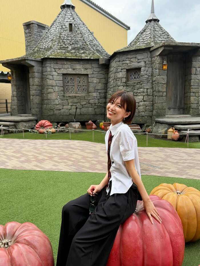 半袖のシャツにネクタイと黒のパンツ姿でメガネをかけたコーディネートを披露し、このスタイルは「ちゃんと学生ぽく白シャツ着ていって グリフィンドールの生徒に笑」と、服装も『ハリー・ポッター』を意識したことを明かしています。