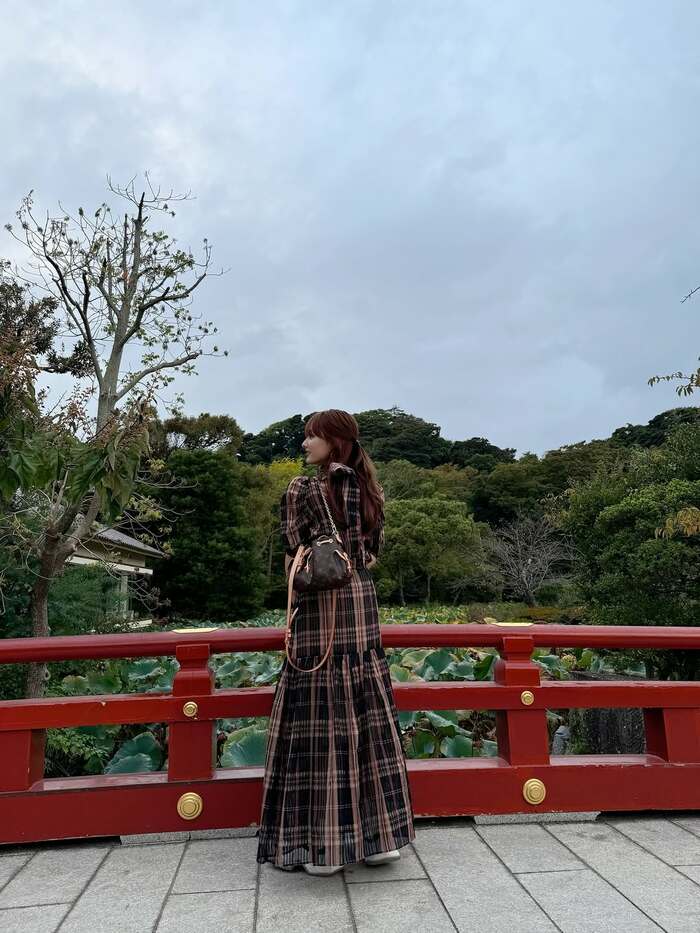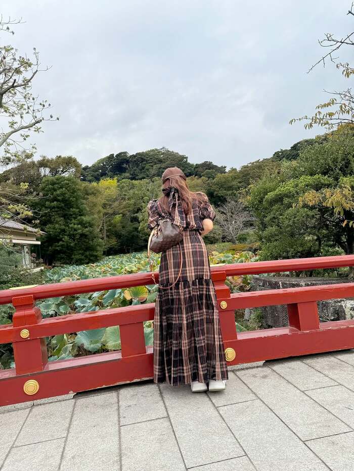 ブラウンのチェック柄ロングワンピースで着飾った谷さんは、自然広がる赤い橋の上でパシャリ。肩にかけているブラウンのバックも相まって、秋の気配を感じるすてきなコーディネートです。