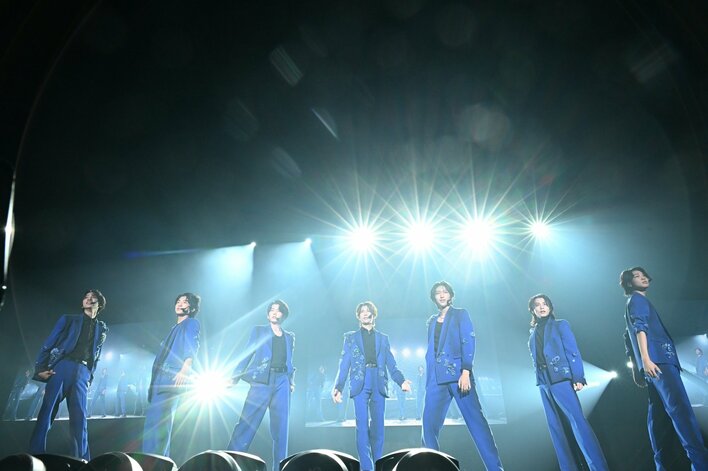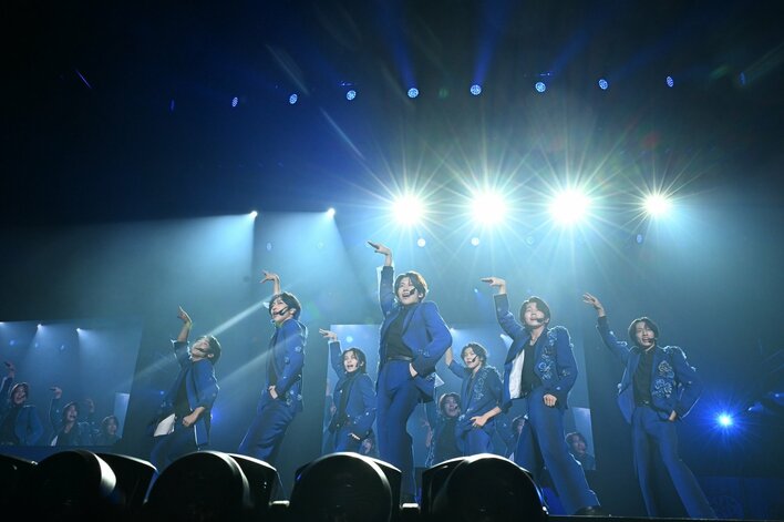 会場に色とりどりのペンライトが灯ると、ステージ中央に7人が登場。センターステージに移動し、ブルーの衣装で揃えた7人が、軽やかでキレのあるダンスと歌で盛り上げます。
