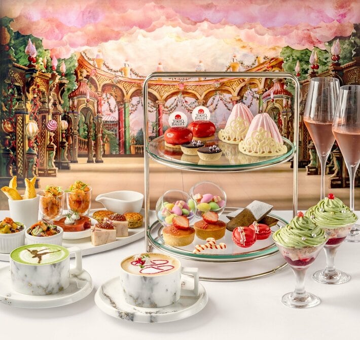 今年の東京バレエ団の『くるみ割り人形』公演のメインビジュアルに起用されている、第2幕「お菓子の国」のシーンの舞台美術。館内のフレンチレストラン・カフェ&バー「ラ・セヌ」でご提供する本アフタヌーンティーは、お菓子の国で披露される様々な国をイメージした踊りからインスピレーションを得たスイーツとセイボリーをご用意します。