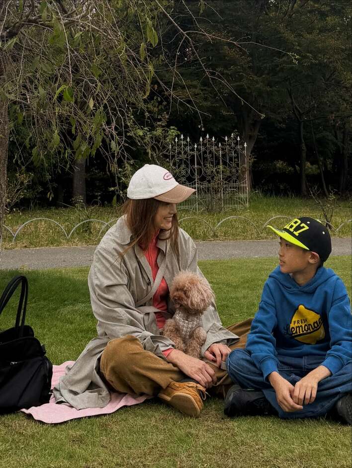 投稿では、最近お出かけしたときのものなのか、公園の芝生の上で8歳息子と一緒に座り、まったりとしている親子ショットを公開!