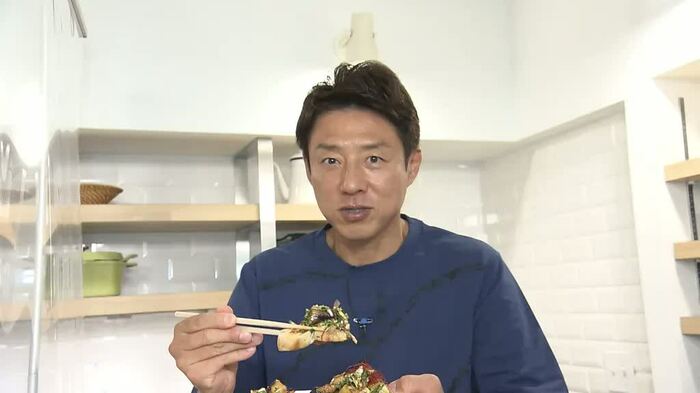 そして、しょうゆと酢のさっぱりタレでヘルシーな「鶏むねとなすの香味和え」が完成。「すごい香りですね」と、ひと口頬張った松岡さんは、「なんで?って思うほどパサパサしていない」と、鶏むね肉のジューシーさに目を丸くします。