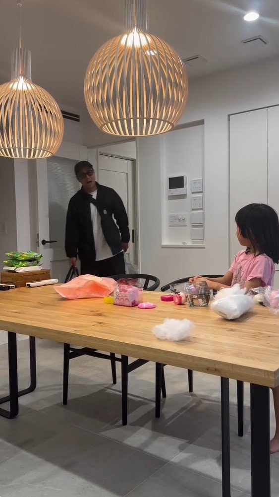 動画は、娘・さくちゃんがリビングのテーブルでおもちゃをいじりながら尾形さんを待っているところから始まります。