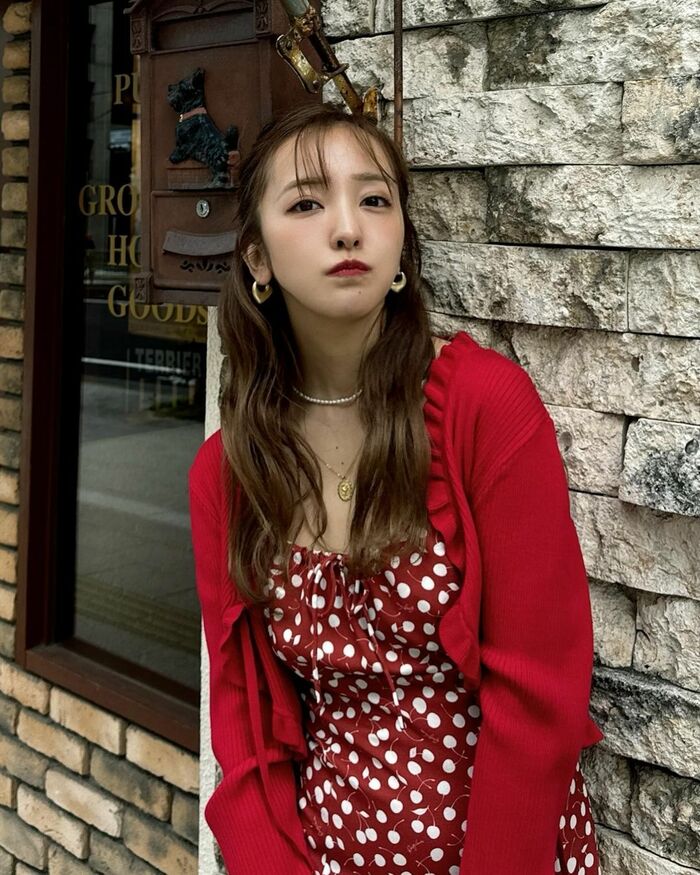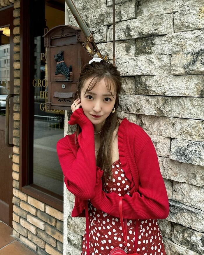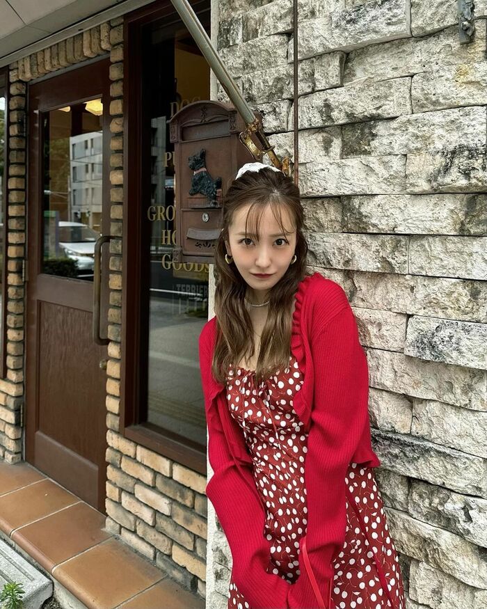 板野さんは「赤な気分 10枚以上投稿できるようになったの? 何枚目すき?」と12枚の写真を一気にアップ!珍しく前髪がつくれらたハーフアップヘアで、ドット柄のワンピースにカーディガンを羽織った全身赤なスタイルに。