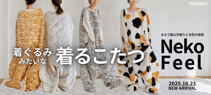 株式会社ニッセン(本社:京都市南区、代表取締役社長:羽渕淳)は、オリジナル寝具ブランド「猫Feel (以下、猫フィール)」の新商品「着ぐるみこたつ」を、ニッセンオンラインショップ(https://www.nissen.co.jp/) で10月23日(木)より販売開始いたします。また、発売を記念して新商品をご購入いただいた方に、非売品「猫Feelポーチ」をプレゼント(先着300個)。詳細についてはキャンペーンページをご確認ください。