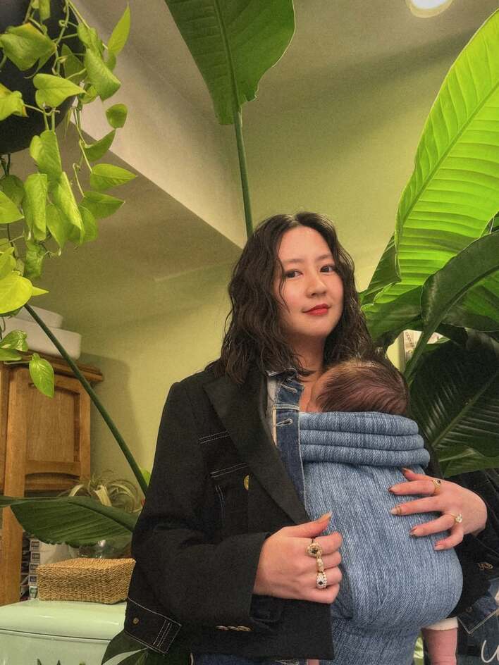 河北さんは、デニム地のスタイリッシュな抱っこ紐で子どもを抱きかかえ、にっこりとほほ笑みカメラを見つめています。