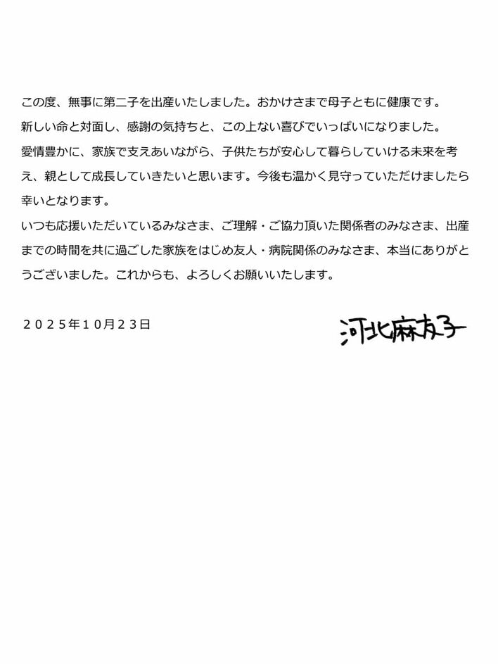 そんな河北さんは今回、「この度、無事に第2子を出産いたしました。おかげさまで母子ともに健康です。」と、直筆の署名入りのメッセージで第2子を出産したことを報告。