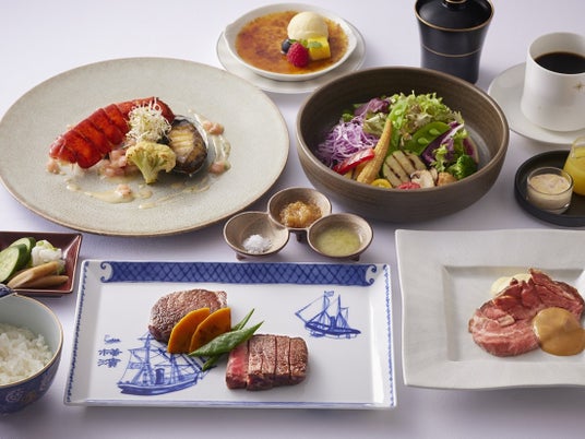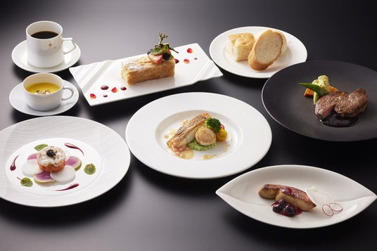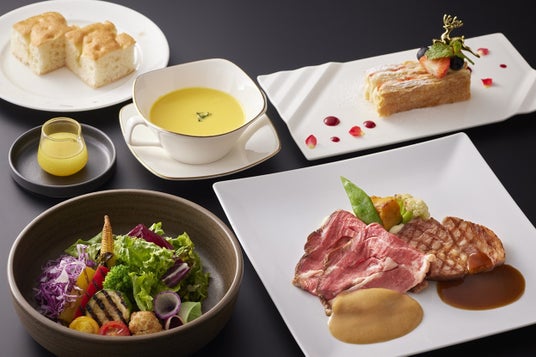 ディナーコースには、キャビアやフォワグラ、トリュフなどを取り入れた華やかなコースをご提供。鉄板焼カウンターで仕上げる黒毛和牛ステーキの2コースに加え、ホテル伝統の“ローストビーフ”を主役としたコースもご用意しております。