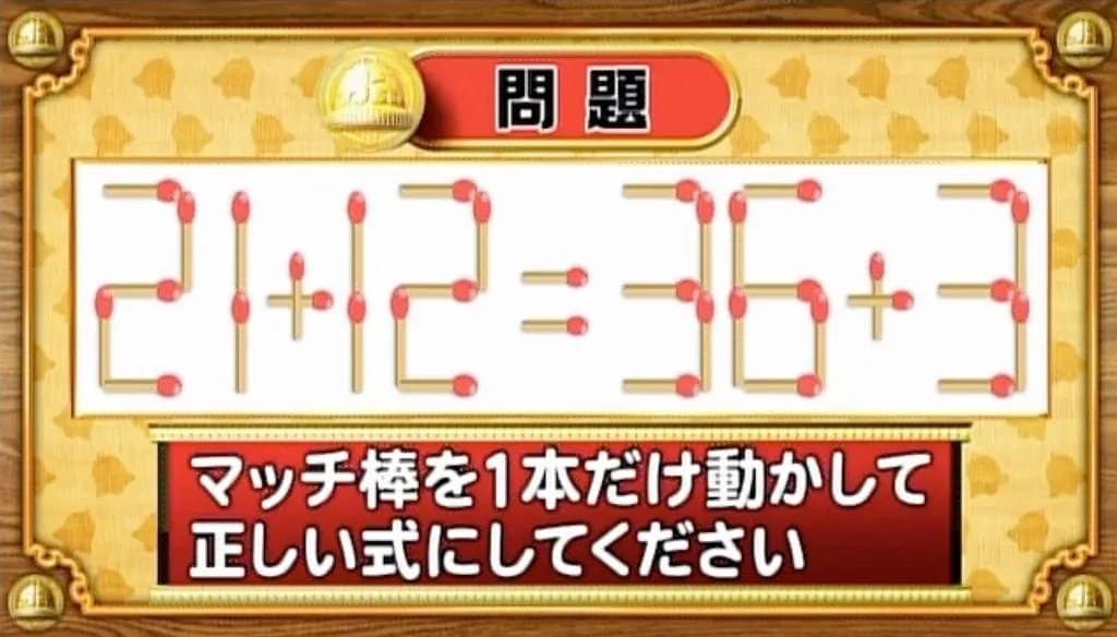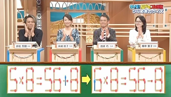 正解は、まず右の式の「+」から1本取って「-」にします。それを左の式の「5」に足して「6」にすると「6×8=56-8」となり、正しい式になりました。