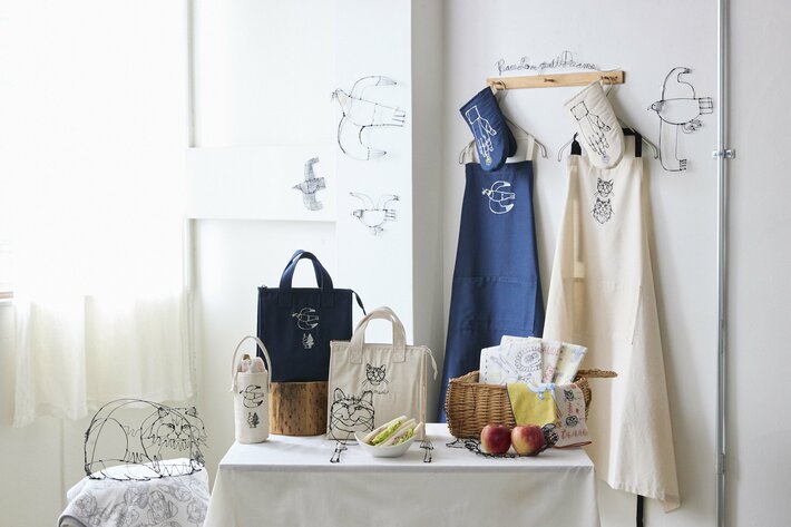 主なラインナップは、エプロン、キッチンミトン、ランチバッグ&ボトルケース、メガネも収納できるメガネコポーチ、などの「+HAyU fabric」シリーズに加え、ロンT、バッグ、靴下などの「+HAyU」シリーズが展開されています。