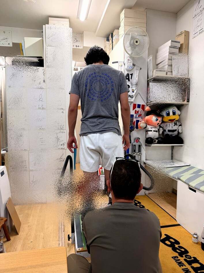 息子は専門器具のようなものの上に立ち、店員さんのサポートのもとでスキーブーツをフィッティング。上着を脱いでグレーのTシャツになった後ろ姿は、肩幅ががっしりとしています。