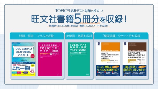 本作には、株式会社旺文社より出版された、TOEIC(R) L&R テスト対策に役立つ書籍5冊分のデータ(問題数 約1,800問、英単語・熟語2,200ワード)を収録!