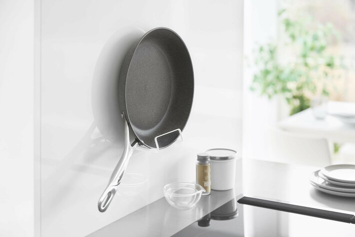 マグネットがつくキッチンパネルに浮かせて収納できるフライパンホルダーです。