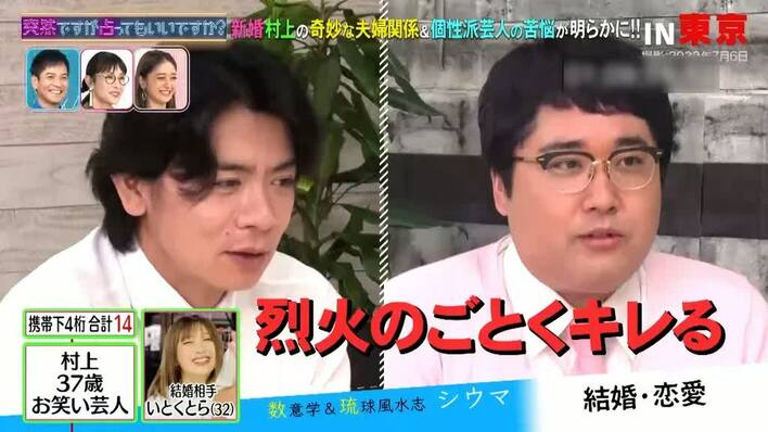 村上さんは2022年7月に、踊り手の、いとくとらさんと結婚。相性を占ってもらうため、村上さんは、いとくとらさんの携帯番号の下4桁の合計数をシウマさんに伝えました。