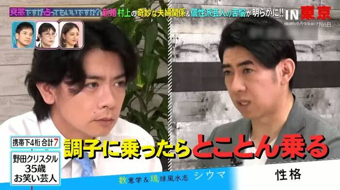シウマさんいわく、野田さん(携帯番号の下4桁の合計数「7」)は、「調子に乗ったらとことん乗って、周りの人が離れていく」そう。「人に使われるのは嫌」など特徴を次々と伝えると、野田さんは納得の様子。