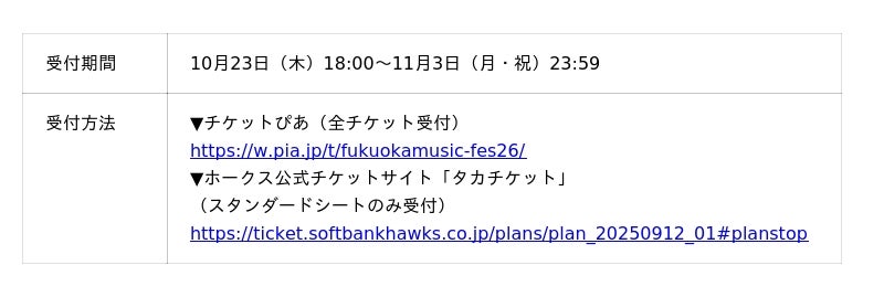 福岡ソフトバンクホークス株式会社は、スペースシャワーエンタテインメントプロデューシング株式会社およびセレクトショップ「BEAMS」を展開する株式会社ビームスと共同でプロデュースする音楽フェス「FUKUOKA MUSIC FES.2026 supported by Olive(通称:福フェス)」の第3弾LIVE ACTとして6組の出演が決定しましたので、お知らせします。