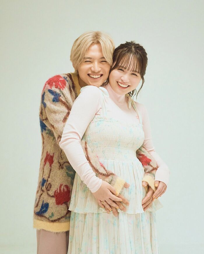 投稿では、ふんわりとした花柄のシフォンのトップスとスカートを着たゆうこすさんに夫・たなかさんがバックハグをして、幸せそうな表情でカメラを見つめるマタニティフォトを公開!