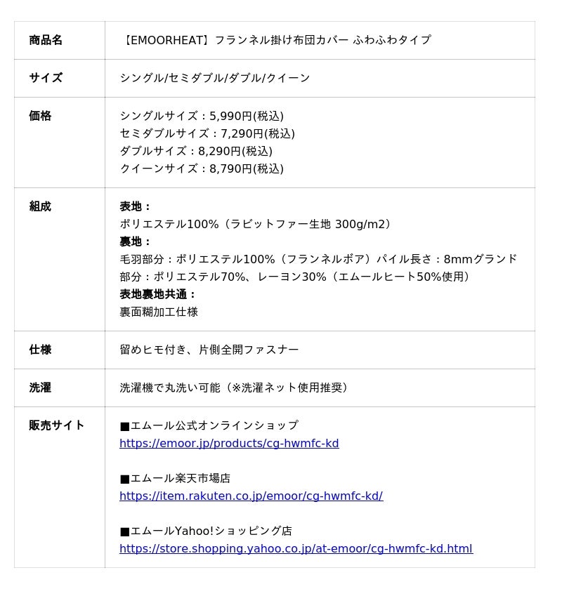 「身体に合った寝る・座る・たたむ」を提供する健康家具ブランドEMOORを展開する株式会社エムール(東京都立川市:代表取締役 高橋 幸司/以下エムール)は、2025年10月23日より、『エムールヒート フランネル掛け布団カバー ふわふわタイプ』の販売を開始しました。本製品は、人の体から発する蒸気や汗を吸収し、熱に変える特殊素材「エムールヒート」を採用。発熱エネルギーを持続的に活用することで、心地よい暖かさが長時間続きます。また、今季新登場の“もこもこ”としたラビットファー生地を組み合わせ、ふんわりとした肌ざわりと見た目の可愛らしさを両立。インテリアにも映える上質なデザインで、寒い季節の寝室を優しく包み込みます。