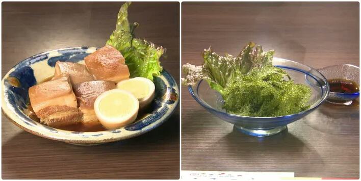 丘みどりが来店したのは、島野菜やアグー豚が自慢の本格沖縄料理が味わえるお店「おきなわ遊食 うるのや」。醤油や泡盛で8時間じっくりと煮込んだ、沖縄名物のラフテー(880円)は、味がしみこみトロトロの食感が最高。沖縄直送の海ぶどう(600円)は、プチプチの食感がたまらない。氷結生シークワーサーサワー(650円)で乾杯。※価格は、すべて税別。