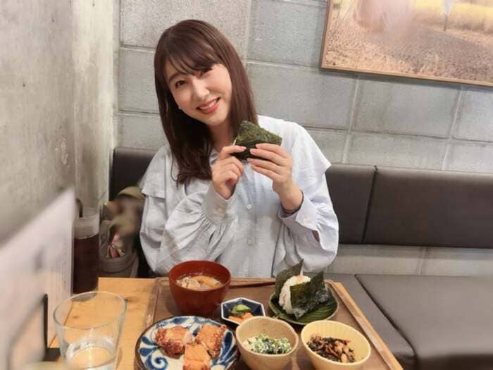 ご飯屋さんで撮られた1枚には、おにぎりを両手で持った安さんの姿が。