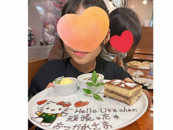 キティちゃんが描かれたデザートプレートをカメラにアピールするように持つ長女。その後ろからは、抱っこされた次女がチラリと顔を出しています。2人の顔はスタンプで隠れてしまっていますが、長女のニコッと笑う口元から、幸せいっぱいなことが伝わってきます!