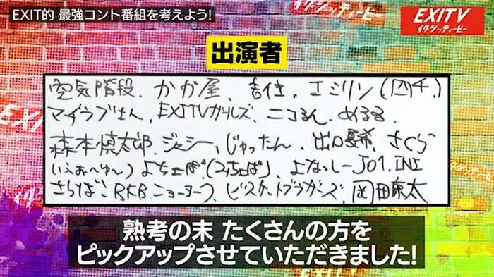 番組スタッフがこの登板表をもとに、企画書を提出している最中との報告が入ると、もっと詳細に内容を詰めようと、「EXIT的 最強コント番組」を”現実的に”考えることに。