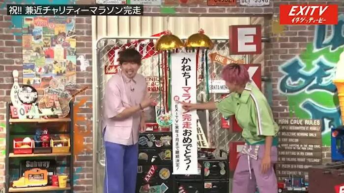 2人は、しばしまだ走っていないチャリティーマラソンをネタにトークをしていましたが、その文字の隣に控えめに書かれた「『EXITV』来年3月まで継続決定!」の文字に気付くと、「自局のこと小さく入れてる!」「(文字の大きさ)逆じゃない?」と驚きます。