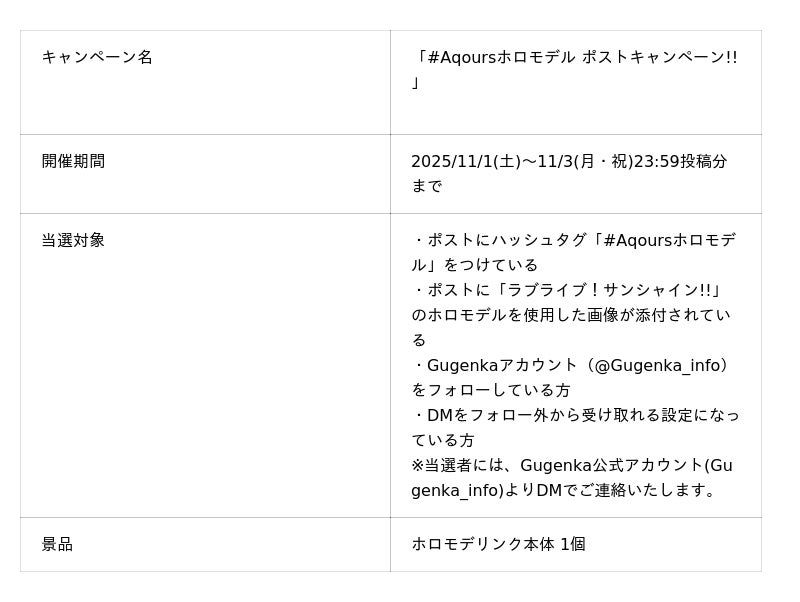 2025/11/1(土)~11/3(月・祝)の期間中に、Xで「ラブライブ!サンシャイン!!」のホロモデルを使用した画像を、ハッシュタグ「#Aqoursホロモデル」をつけてポストした方から3名様に、ホロモデルを飾れるディスプレイ「ホロモデリンク」をプレゼントいたします。