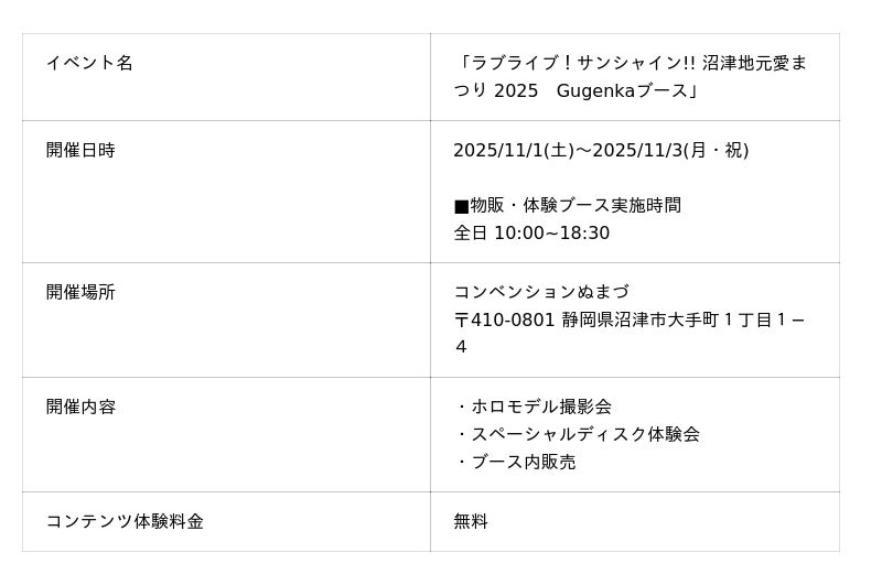 株式会社Gugenka(代表取締役CEO 三上昌史)は、2025年11月1日(土)より3日間開催される「ラブライブ!サンシャイン!! 沼津地元愛まつり 2025」に参加することが決定いたしました。