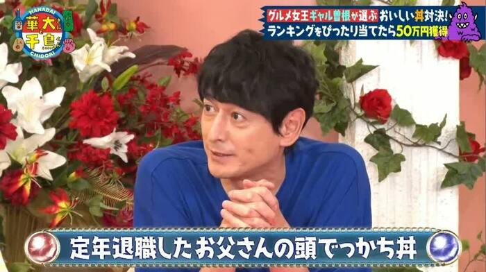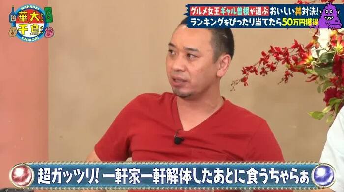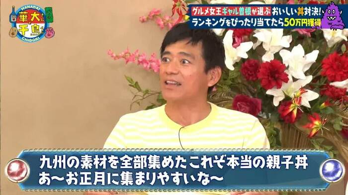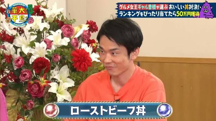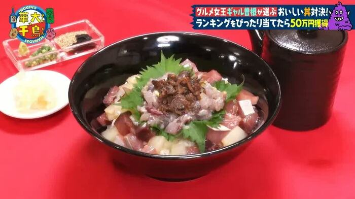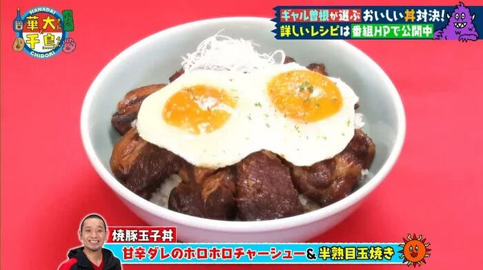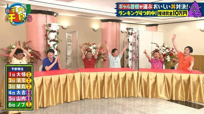 博多華丸さん、博多大吉さん、千鳥(大悟さん、ノブさん)、かまいたち(山内健司さん、濱家隆一さん)がオリジナル丼(どんぶり)を作り、ギャル曽根さんがおいしかった順にランキング。
