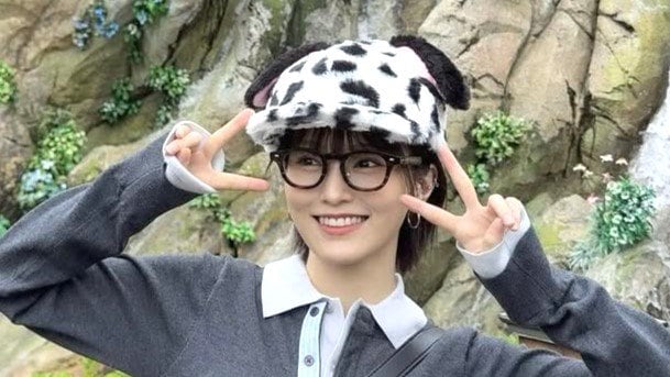 101匹ワンちゃんのもこもこ帽子に黒縁メガネをかけた山本さんは、楽しそうな笑みを浮かべてパシャリ。襟付きの白シャツにグレーのカーディガンを重ね着した、秋らしいコーディネートです。萌え袖からはピースがチラリ!