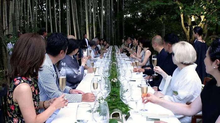 武相荘では、テーブルの真ん中に、七夕にちなんで竹と笹を飾り付け、料理を彩る器は、武相荘に保管されていた骨董品と、敷地内で切り出した竹が使われるなど、この季節に、この場所でしか出来ないイベントになりました。
